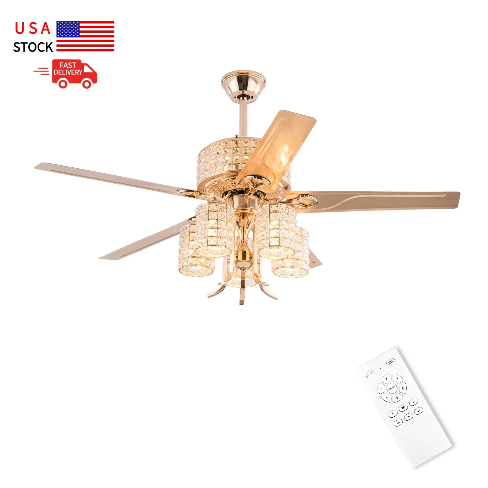 Modern 42-Inch Crystal and Metal Ceiling Fan with LED Light 4 Acrylic Blades DC Motor for Home Living Room Decoration