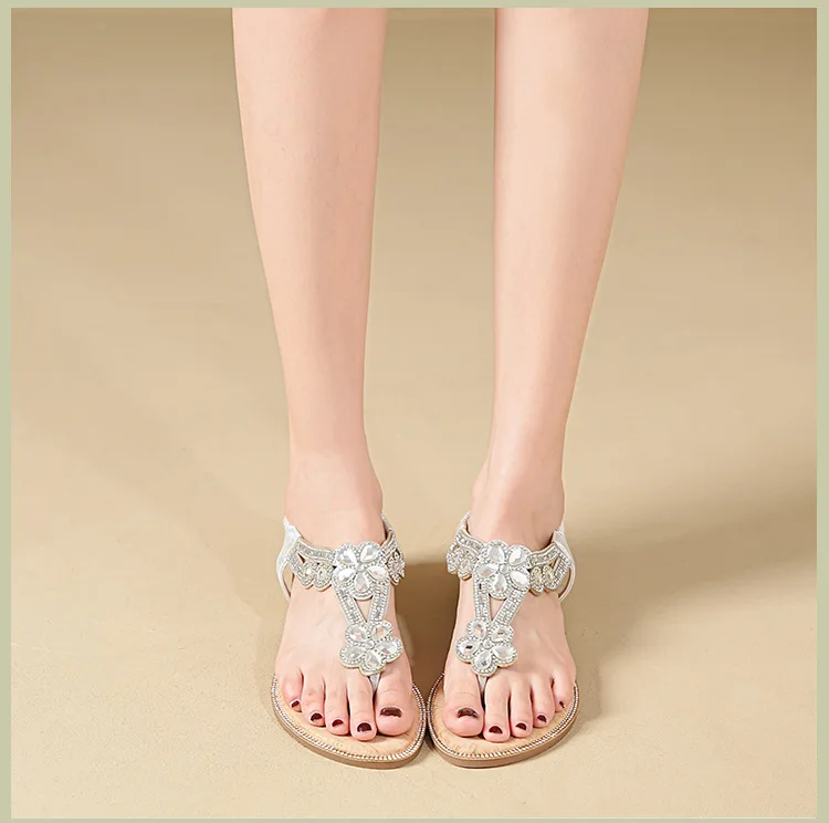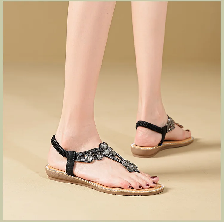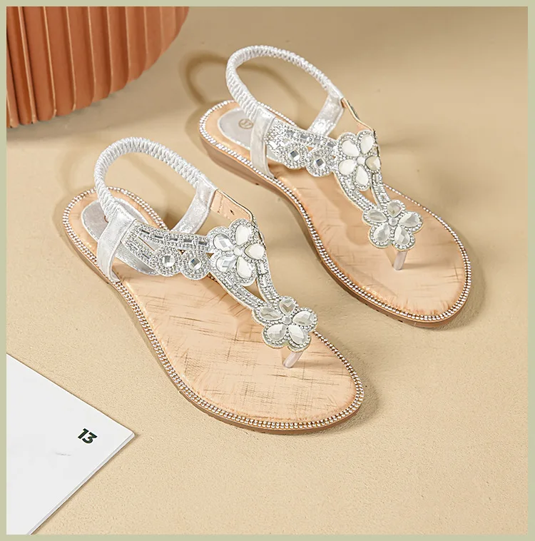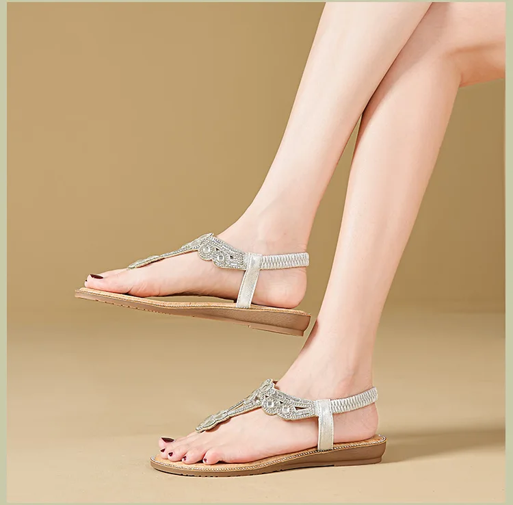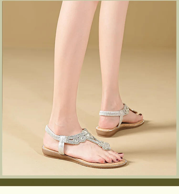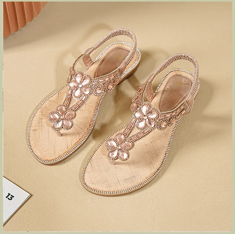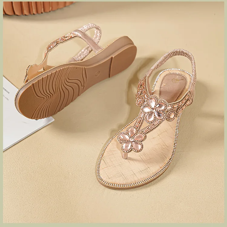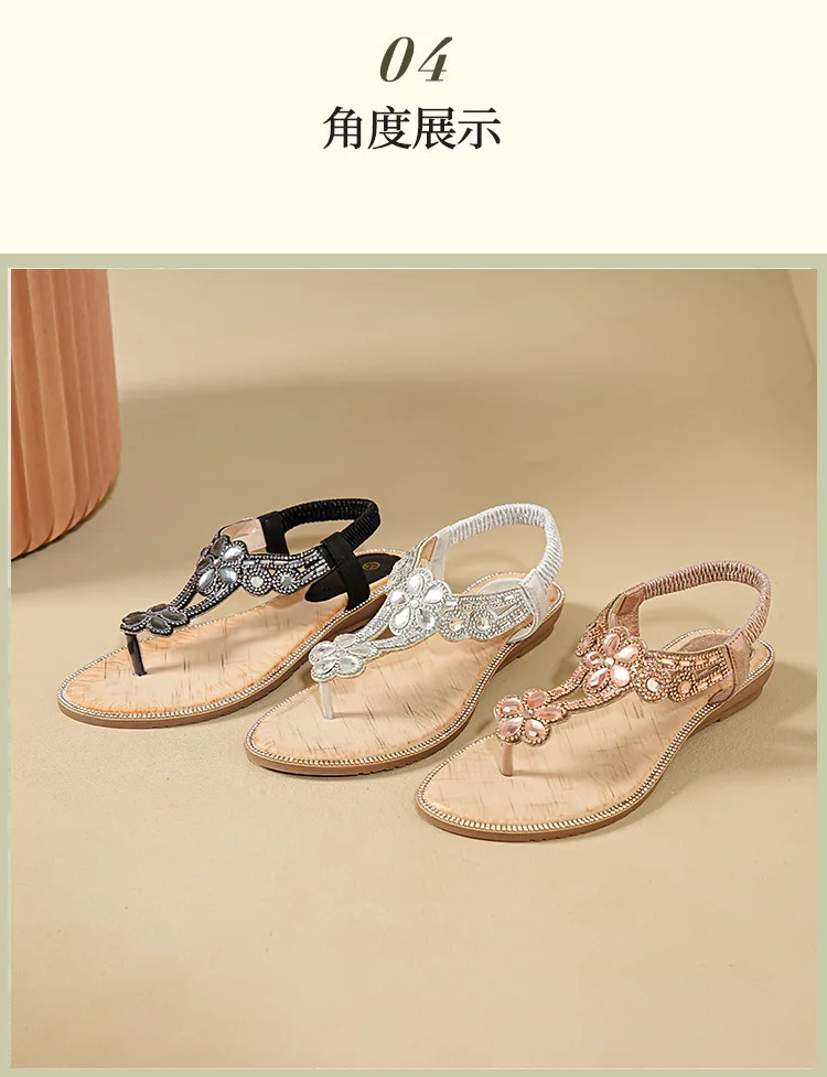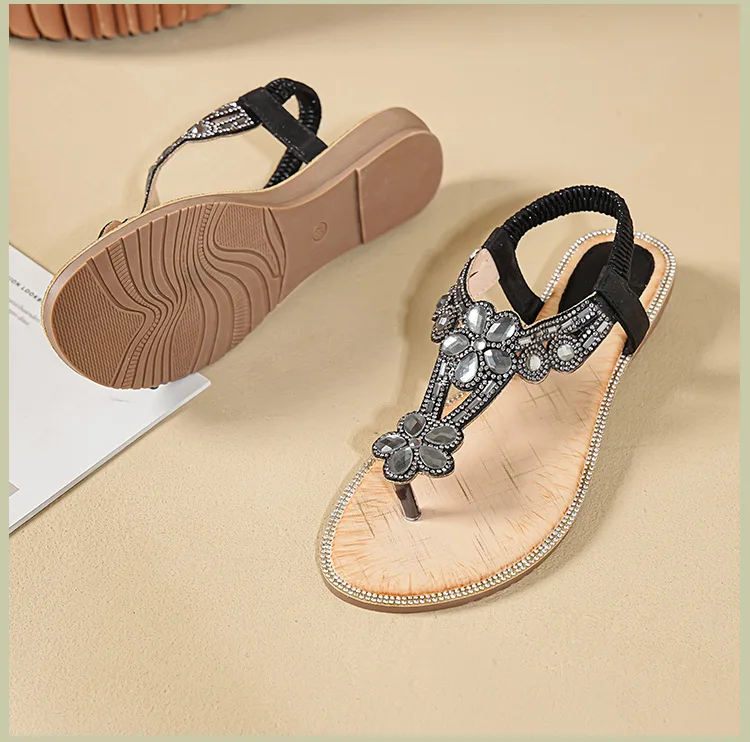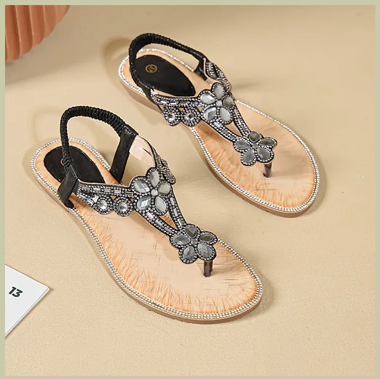 Women’s sandals Bohemian rhinestone flat bottom, slip resistant, comfortable, soft bottom, casual vacation, clip on beach shoes